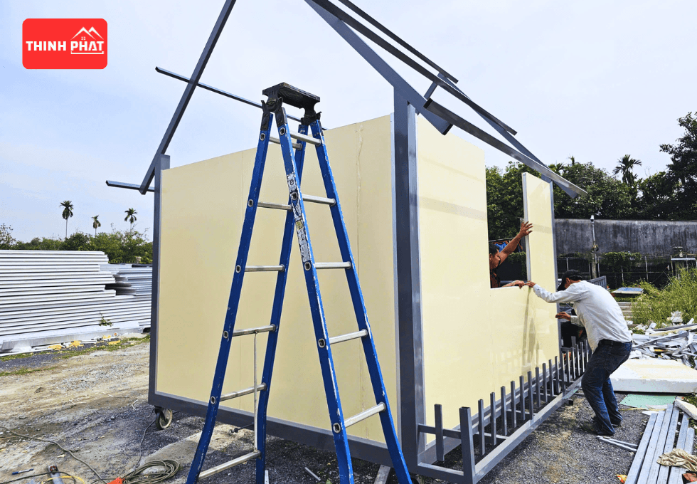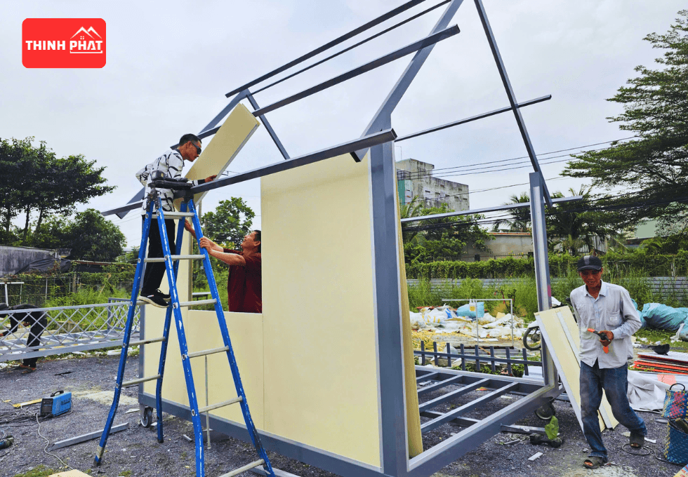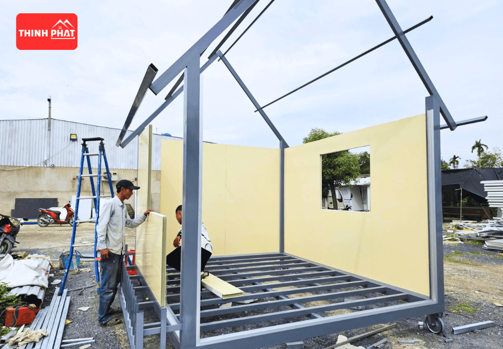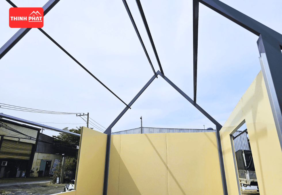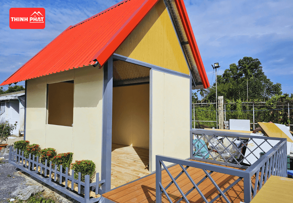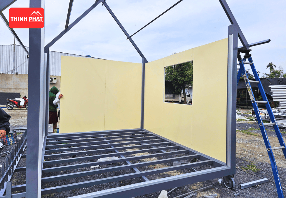 Công trình sử dụng panel EPS vàng kem, tôn PU cách nhiệt, khung sắt và cửa nhôm Xingfa, đảm bảo độ bền, cách nhiệt tốt và tính thẩm mỹ hiện đại.