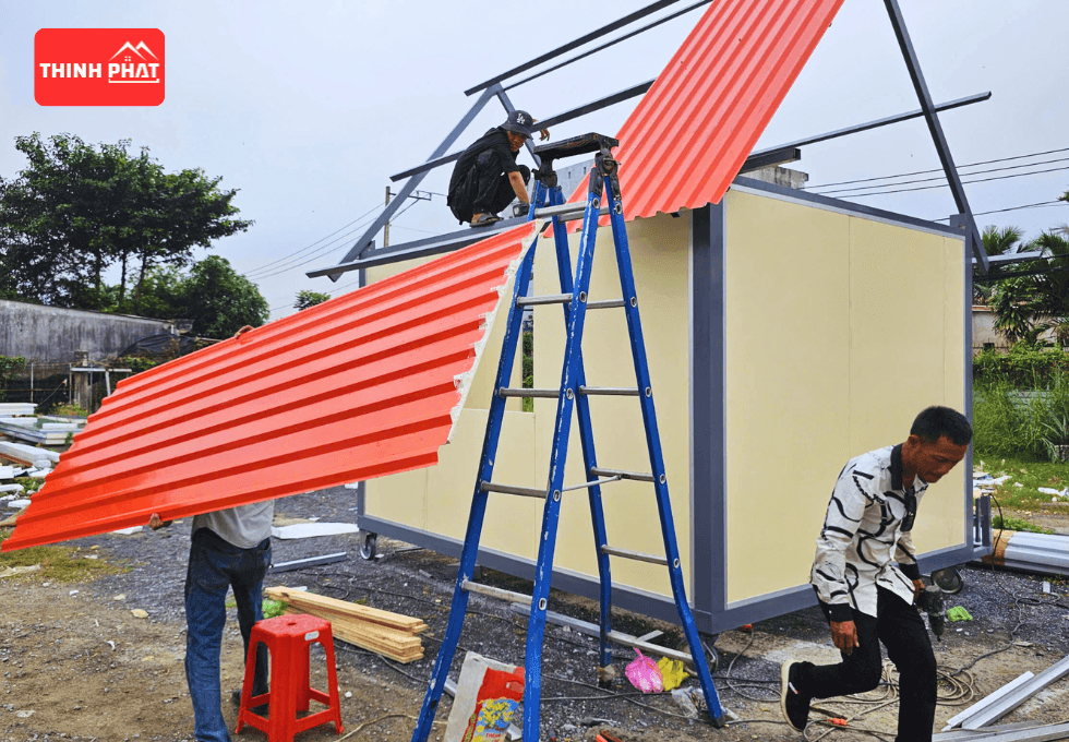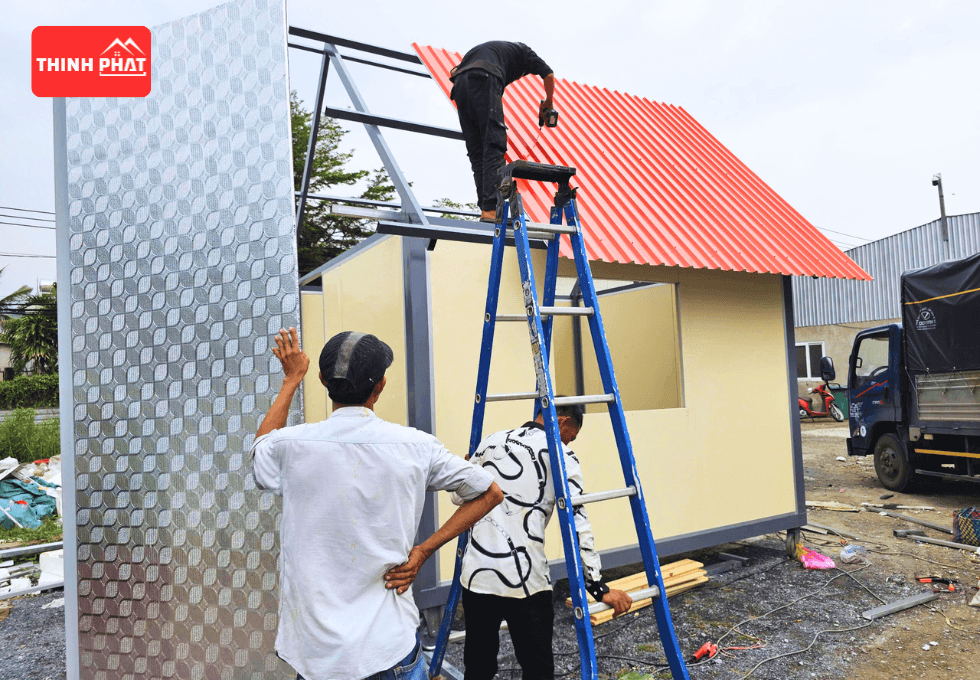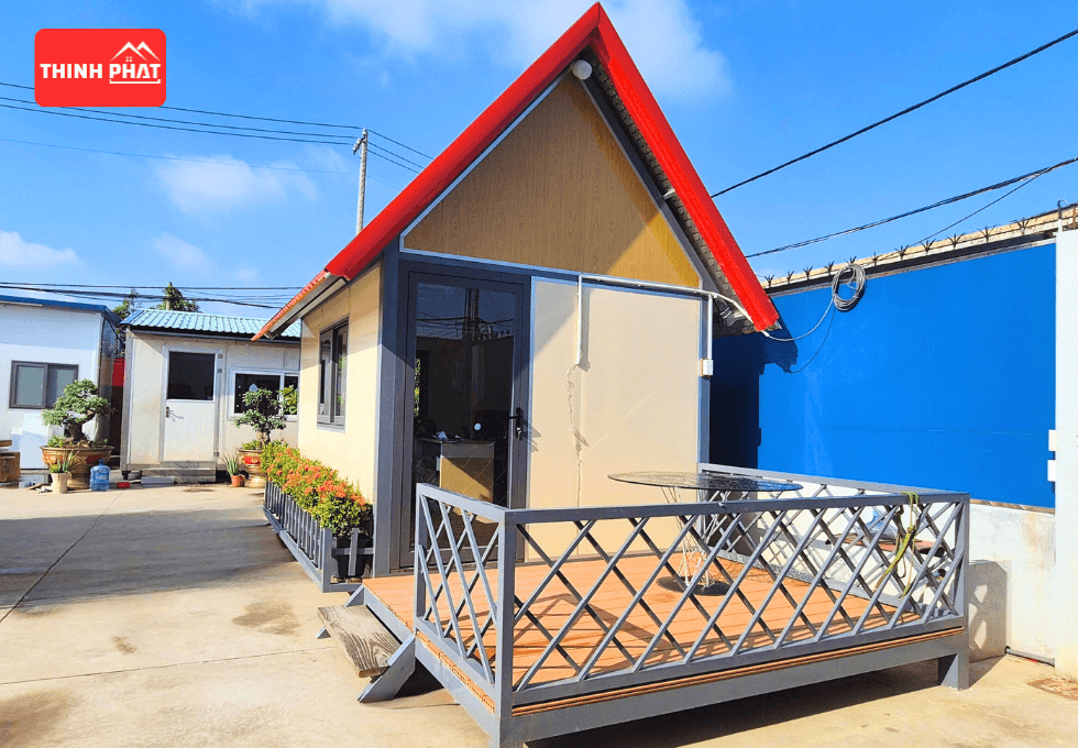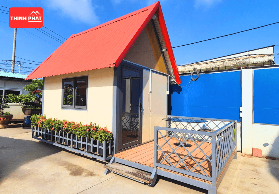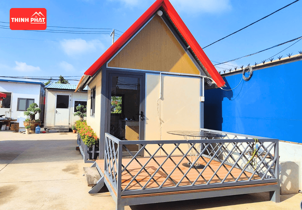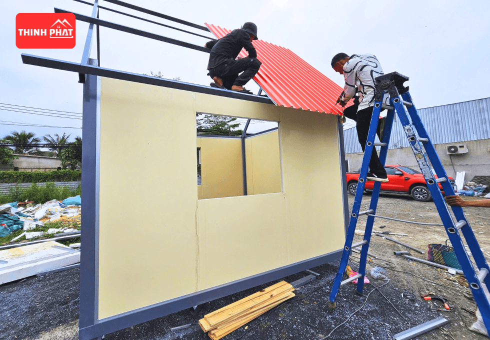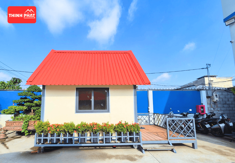Công trình sử dụng panel EPS vàng kem, tôn PU cách nhiệt, khung sắt và cửa nhôm Xingfa, đảm bảo độ bền, cách nhiệt tốt và tính thẩm mỹ hiện đại.